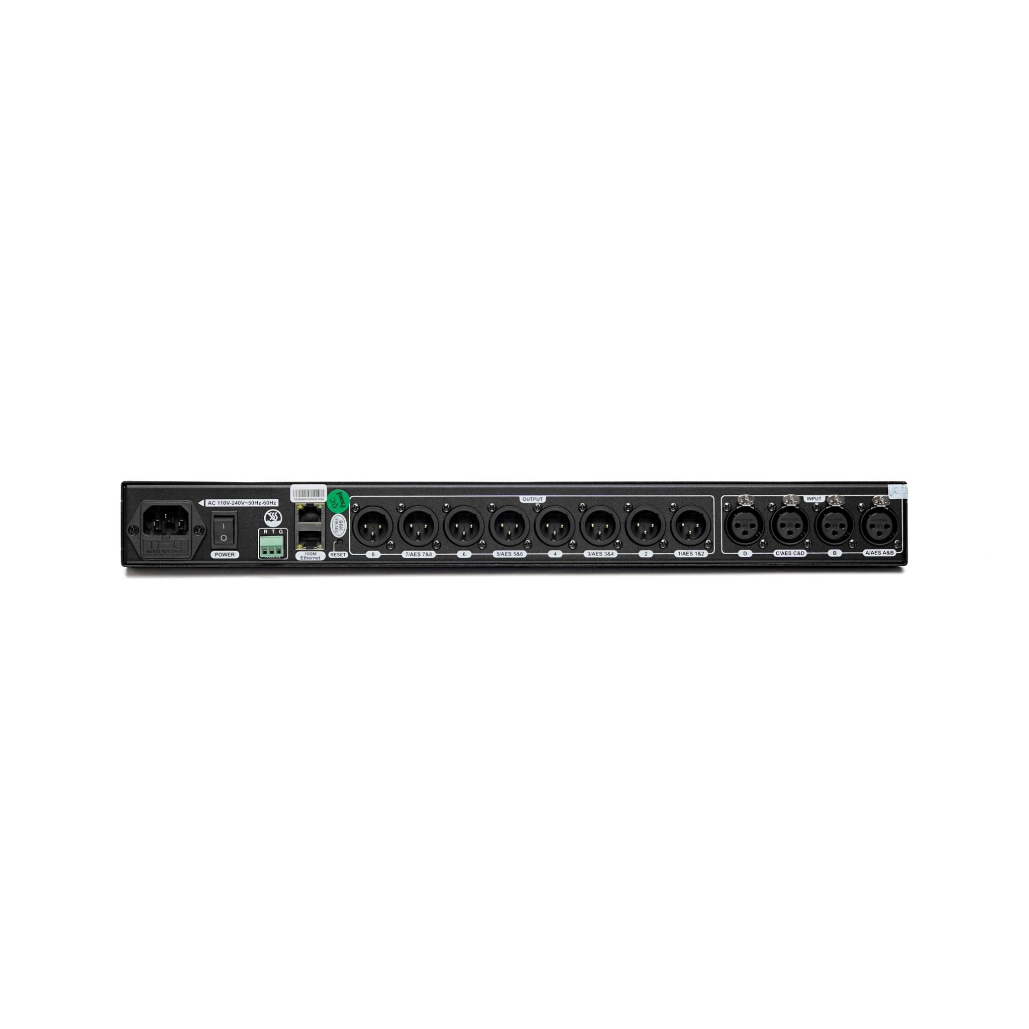 Mặt sau bố trí các ngõ vào và ngõ ra rõ ràng: 4 ngõ input XLR balance và 8 ngõ output XLR balance.